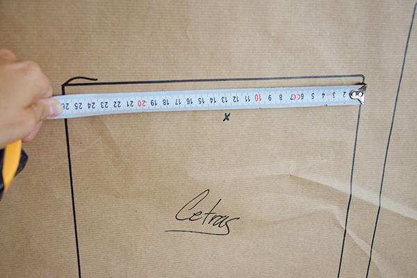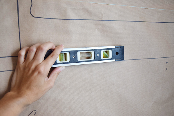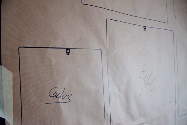 En cuanto me llegaron las laminas estuve componiendo en el suelo como las quería colocar en la pared. Con la composición clara, cogí el rollo de papel de embalar y dibujé el collage.