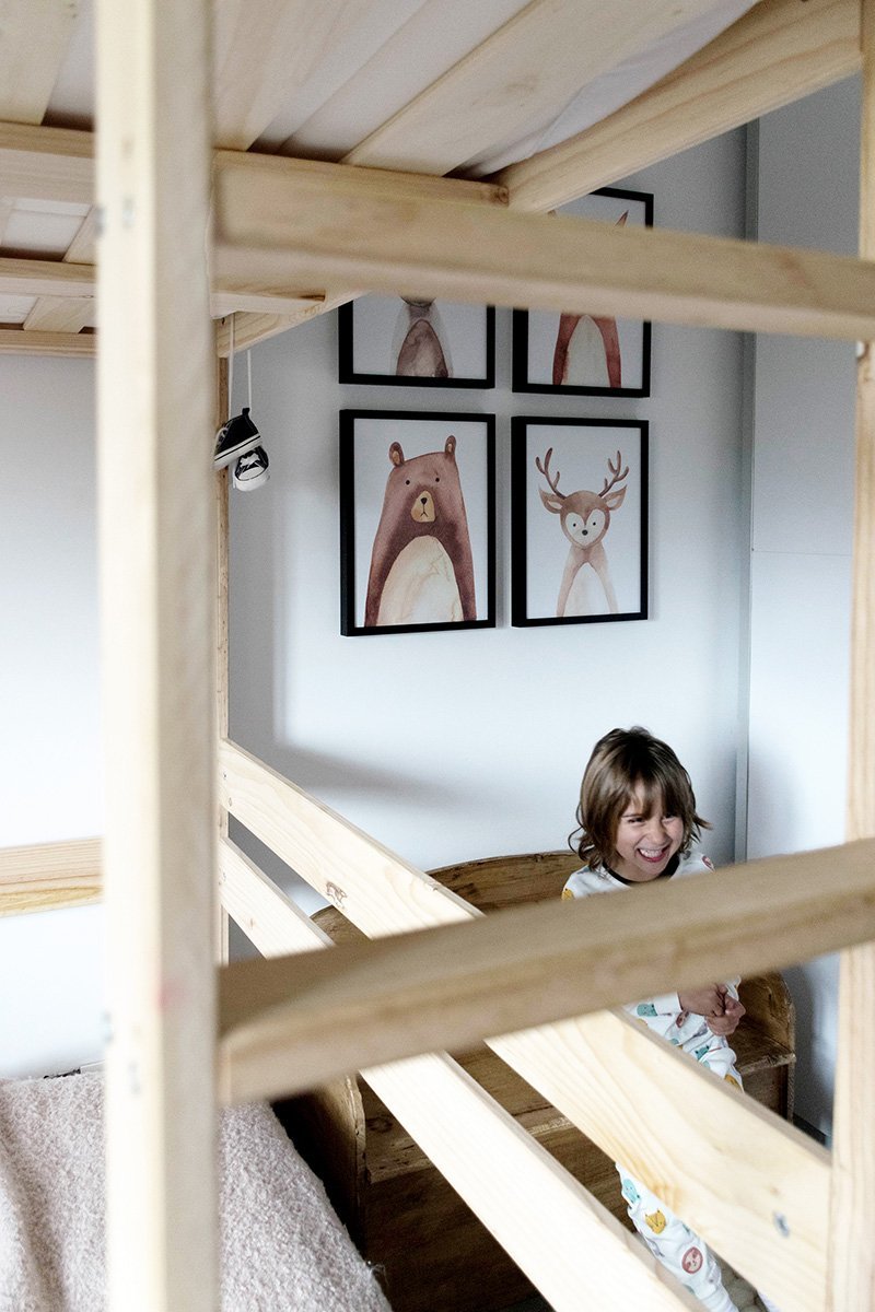 Con la pared completamente seca, montamos la litera, aunque mas bien es una cama alta, porque la zona de abajo te viene libre para que pongas lo que quieras, un sofa, escritorio…. nosotros queríamos reutilizar la camita anterior de Mateo que encajaba perfectamente y con idea a que cuando nos pidan separarse, que lo acabarán pidiendo cuando sean mas mayores…. que en esa zona se pueda poner el escritorio para estudio.