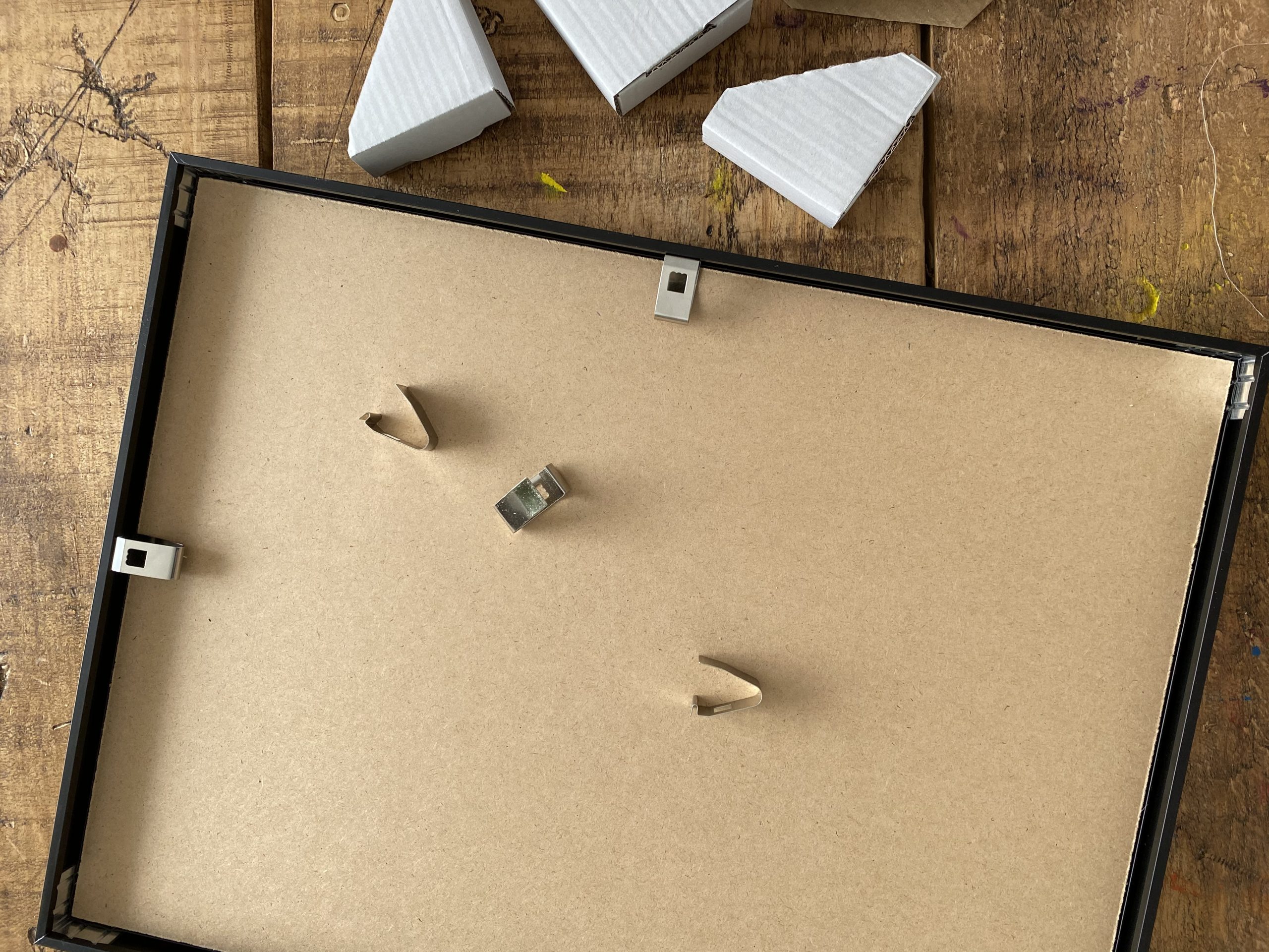 Todos los marcos vienen perfectamente protegidos con esquineras de cartón y laminas de plástico protector, además en su trasera trae unas presillas super cómodas que permiten cambiar de lamina las veces que quieras, y su agujero lo puedes usar para introducir del cuelga fácil o alcayata, otro punto a su favor es que se deslizan perfectamente por toda tu trasera, lo que supone una gran ventaja, porque si te equivocas al hacer el agujero en la pared, siempre puedes mover esta presilla hasta dejarlo en el sitio elegido.