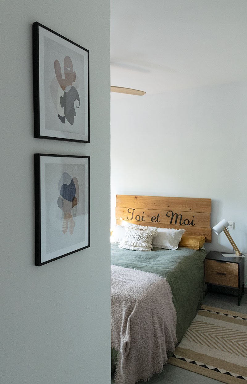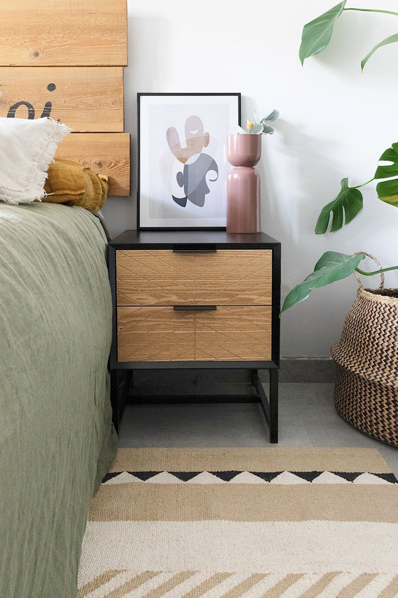 Como alma inquieta que soy, antes de ponerlas en su pared definitiva probé sobre las mesillas y me gustó tanto el resultado que lo fotografié también para daros alguna otra idea a la hora de decorar una mesilla de noche.