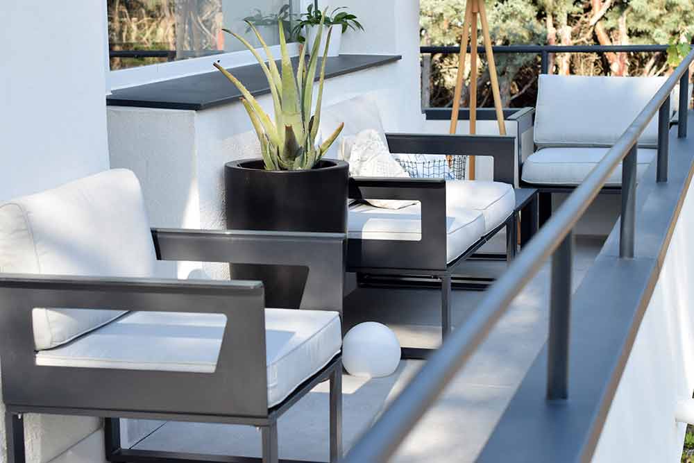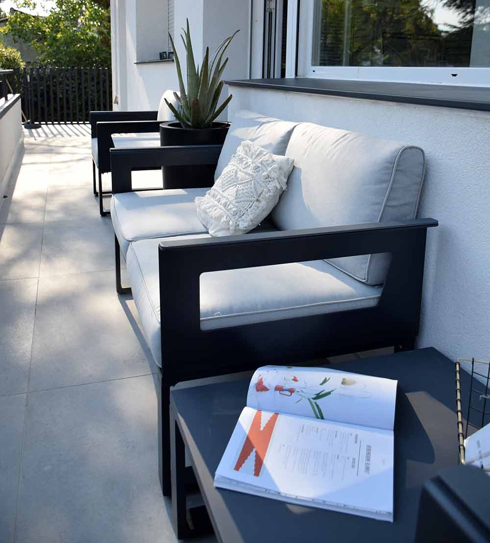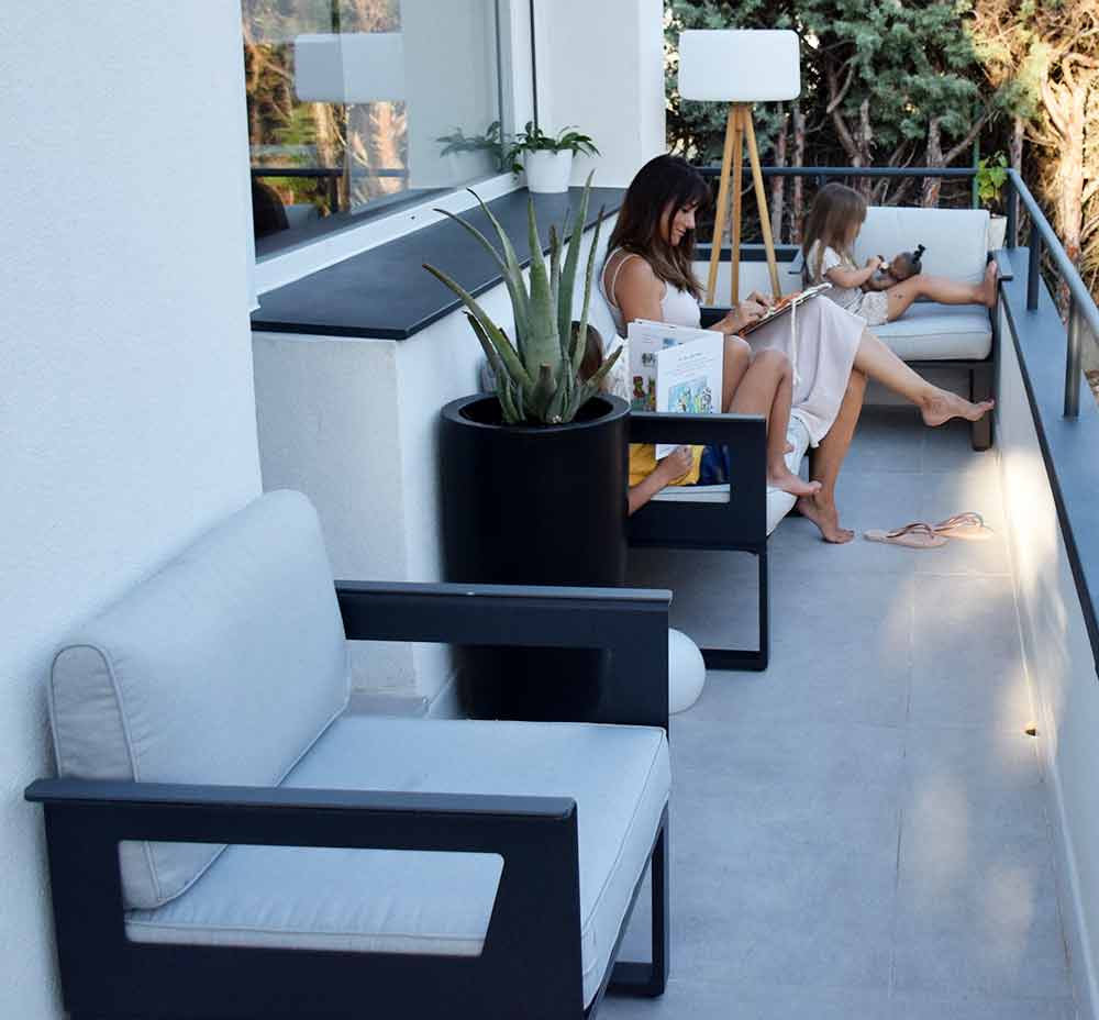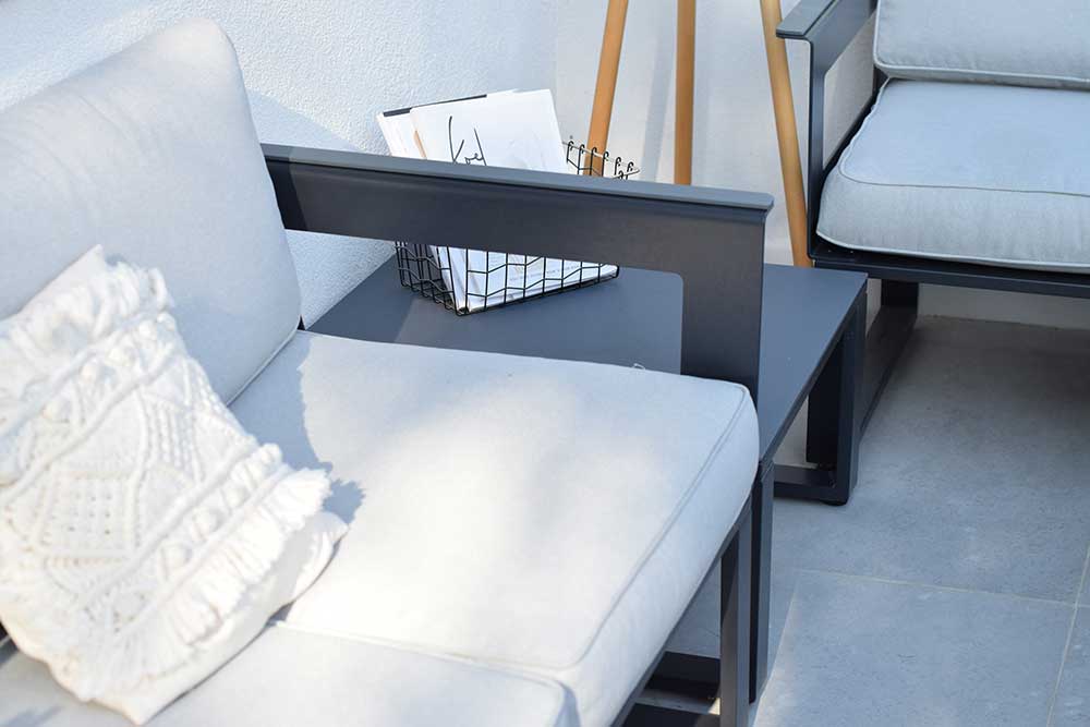 Al tener esta terraza una parte en esquina, nos ha permitido poner una butaca de lado junto con la mesita y hemos aprovechado al máximo el espacio que tenemos con este cojunto de Sofá.