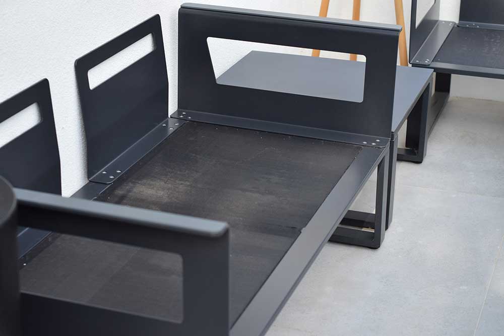 El color de los cojines y respaldos es un gris muy clarito que por mi experiencia con textiles de exterior, es mejor escoger este tipo de tonos claritos, a parte de darle amplitud a la terraza es un color que no perdera mucha intensidad con el sol.