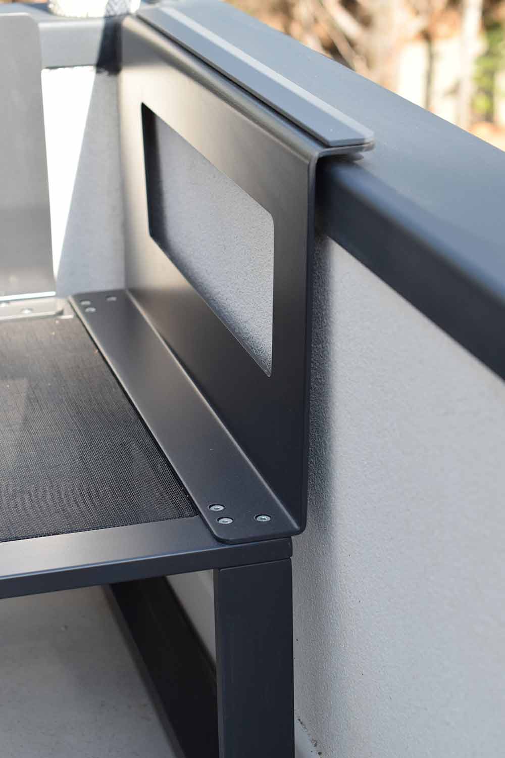 Este conjunto de Sofá de Leroy Merlin cumple con todos los requisitos, tiene una calidad buenísima, es un material resistente a la intemperie y como veis en las siguientes fotos, su estructura es muy fina y se ajusta perfectamente a las paredes (incluso con el rodapié) para dejar espacio a lo mas importante, los cojines y respaldos.