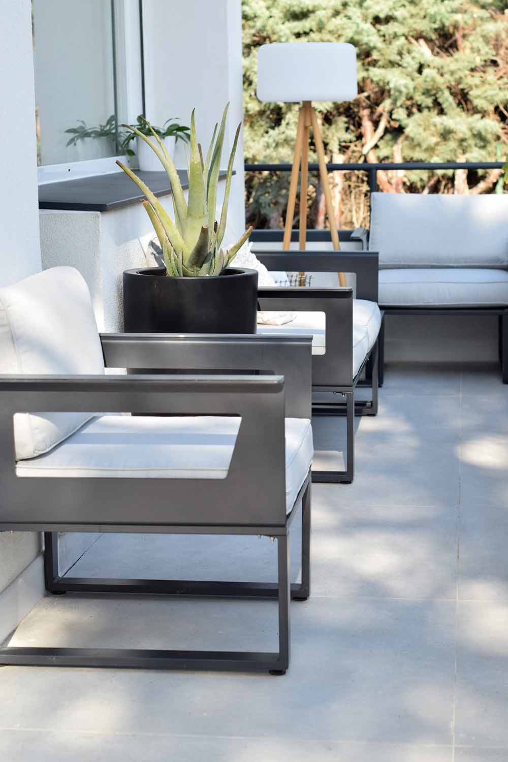 Si queremos darle un toque verde con alguna planta es muy importante que a parte de escoger la planta correcta para el espacio, sea una planta poco voluminosa que no reste espacio a nuestra terraza. Yo he escogido una Aloe vera, que le da el toque verde necesario pero no nos quita espacio.