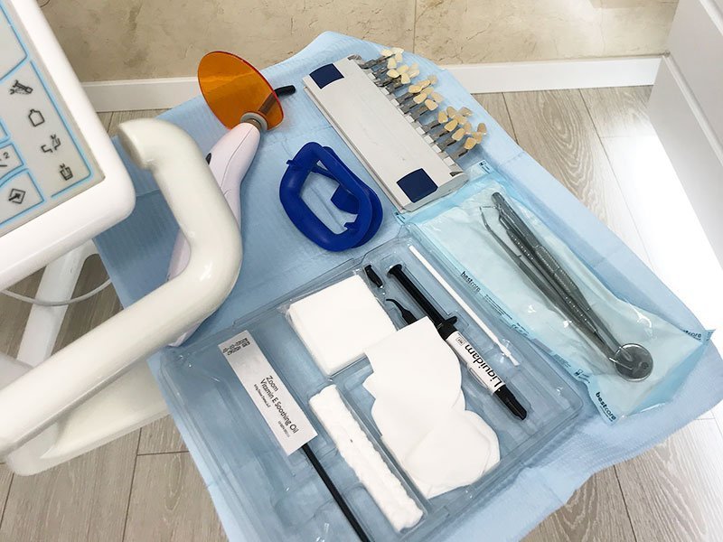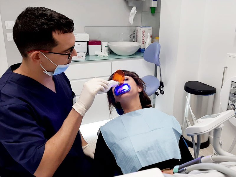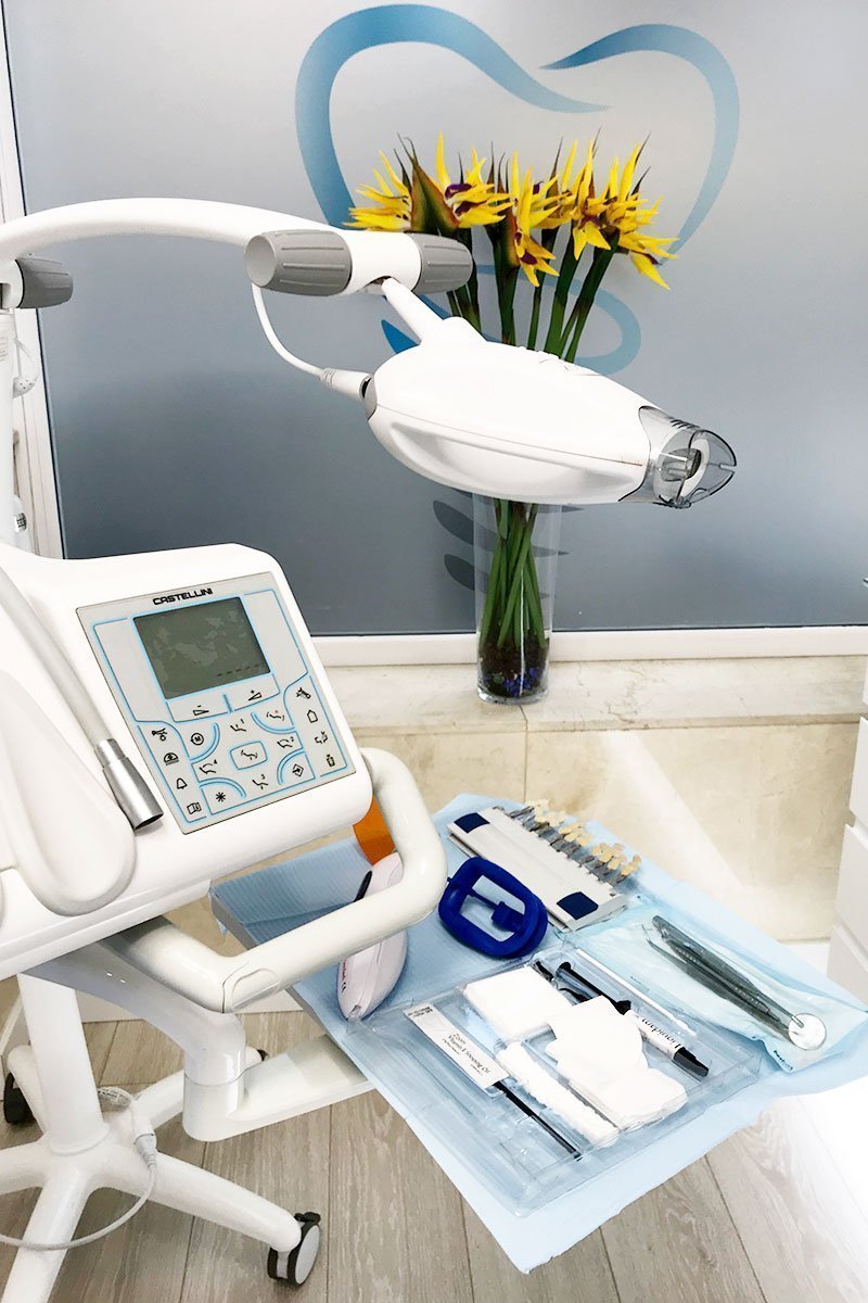 Consiste en aplicar peróxido de hidrógeno en los dientes, este tratamiento es de colmillo a colmillo, en las muelas no se hace y con 3 sesiones de 15 minutos podrás blanquear hasta una media de 8 tonos de luminosidad.