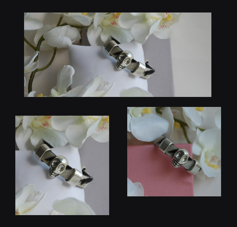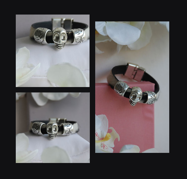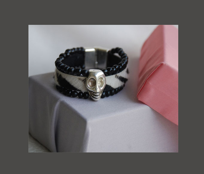Pulsera en piel con pelo de cebra, calavera y detalles plateados. Cierre Imantando. Precio: 18 Euros Pulsera en piel con pelo de cebra, calavera plateada y tiras de bolitas negras. Cierre imantado. Precio: 15 euros.