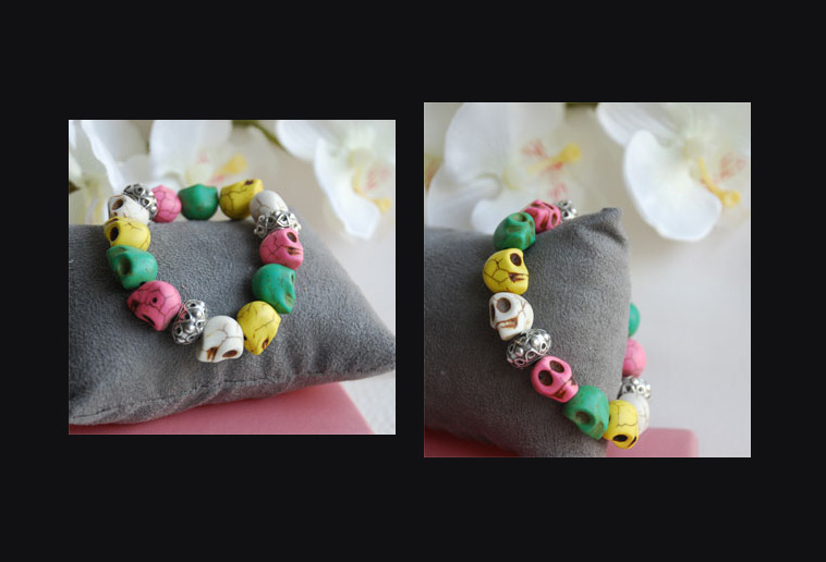 Pulsera elástica con calaveras de colores y detalles metálicos. Precio 10 Euros.