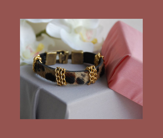 Pulsera en piel con print de leopardo con cadenas doradas. Precio: 12 Euros.