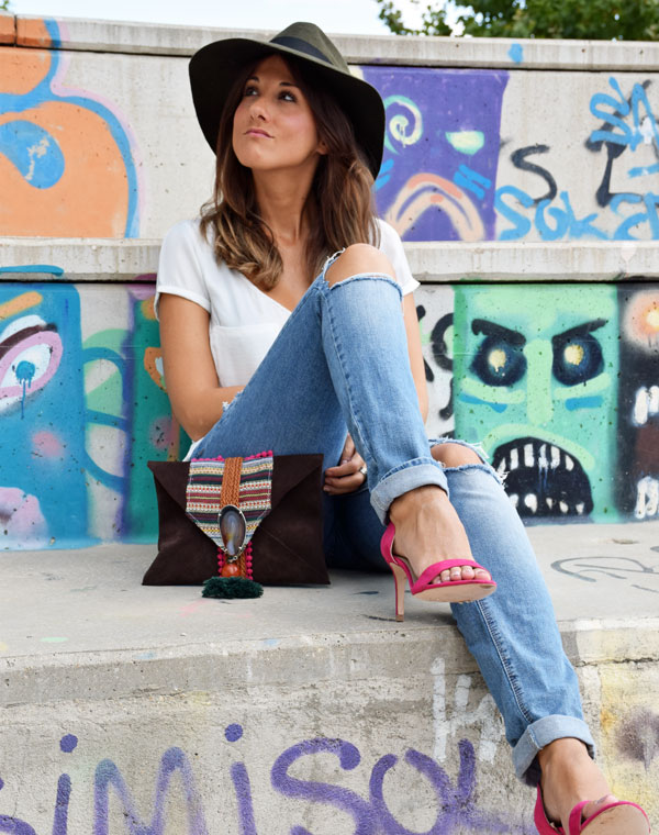 Las fotos del cuarto y último boslo de la Colección ágata vienen cargadas de contrastes, la unión de lo callejero, con el bolso bohemio y el toque chic del look coronan el final de esta colección.