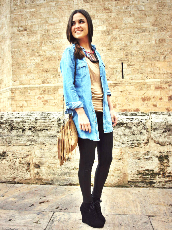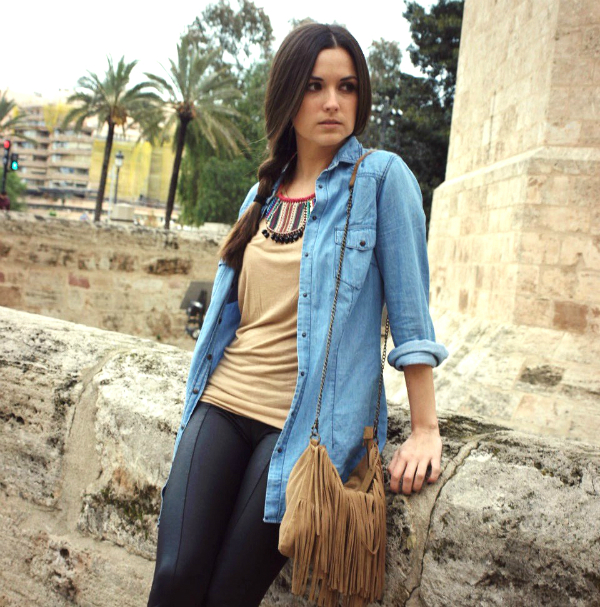 No hace falta decir que la chica es lindÍsima y siempre va ideal, así que ha combinado a la perfección este collar, una camiseta básica color tierra, el toque desenfadado del denim y leggins de cuero lo convierten en un look de 10! todo esto combinado con un bolso de flecos le da la pincelada étnica en su justa medida para no quitar protagonismo al collar.
