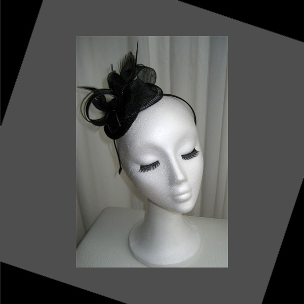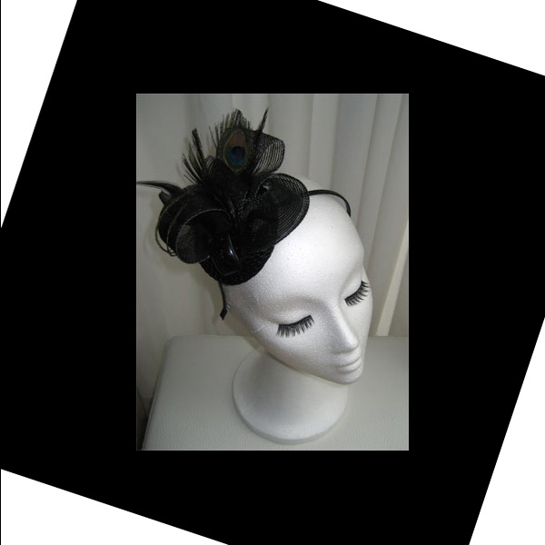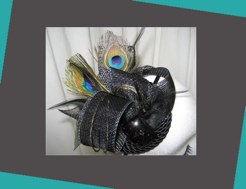 Este otro tocado con plumas de pavo real que dan un toque luminoso y alegre a la sobriedad del color negro. Muy elegante y se puede lucir en muchas mas ocasiones y fiestas además de la boda.