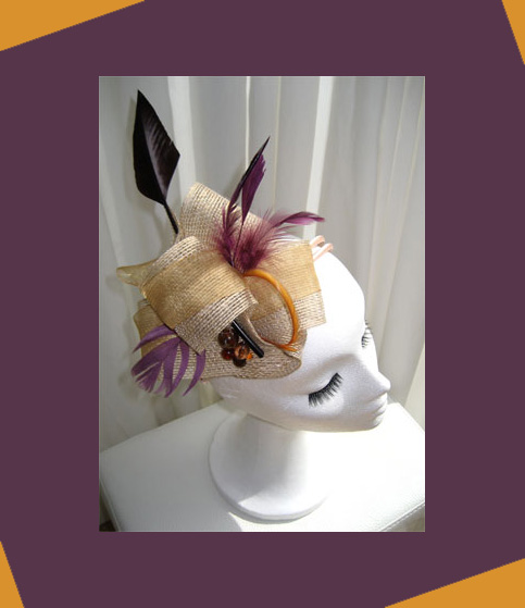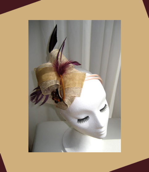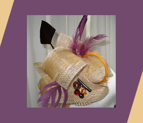 Tocado con rafia en crudo, organdí dorado y plumas en color morado para darle el toque de color que no puede faltar en un buen tocado, también acompañado con bolas en tonos tierra y dorados.
