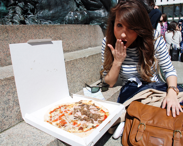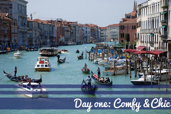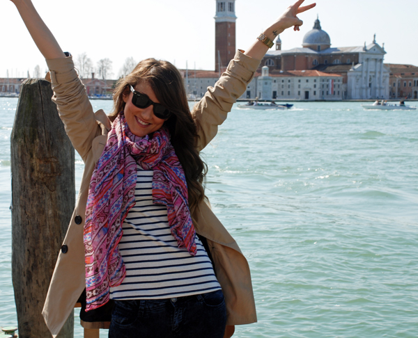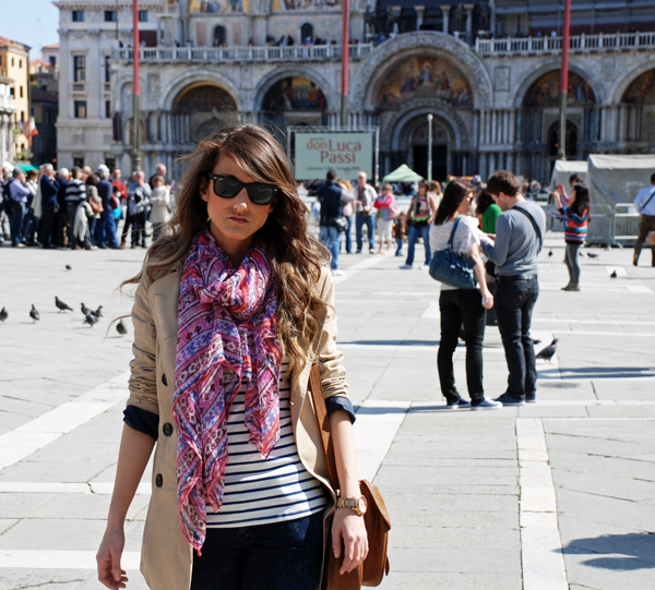 Para el primer día y con ganas de ver todo elegí un look un tanto gondolero; camiseta a rayas y vaqueros, comodidad ante todo con mis Converse y un toque mas chic con la gabardina…..