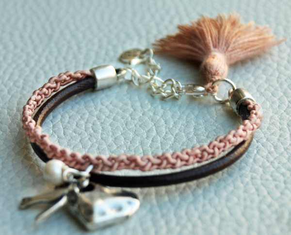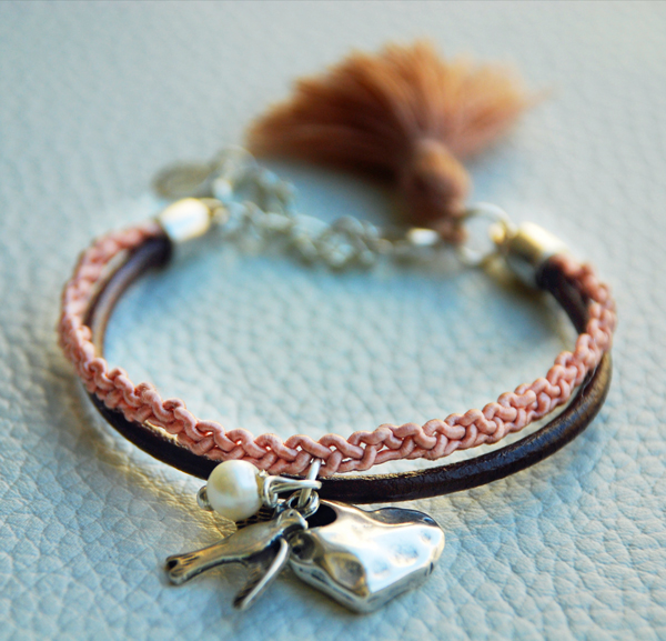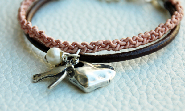 Decidí combinar cordón de cuero con una trenza de seda en rosa palo, sabiendo que Raquel es de Gran Canaria, nada mejor que una golondrina típica de las zonas costeras para acompañar al corazón y a la perla, que es la que aporta el toque delicado y chic al conjunto.