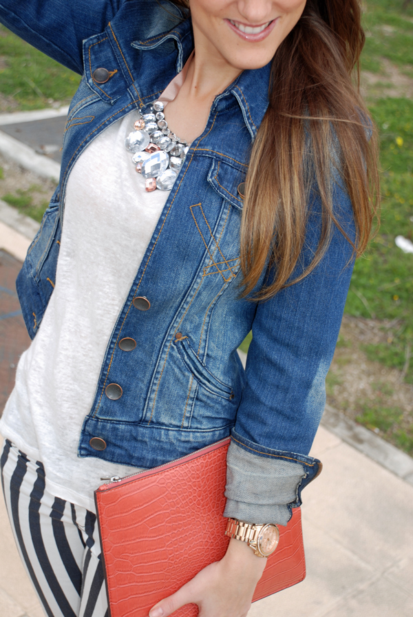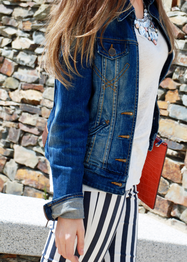 Camiseta básica, cazadora vaquera y el pantalón tendencia de esta temporada, (como ya os comentaba en “Bitelchus en nuestro armario” ) un look cualquiera, que con el toque del collar aportamos la pizca glam.
