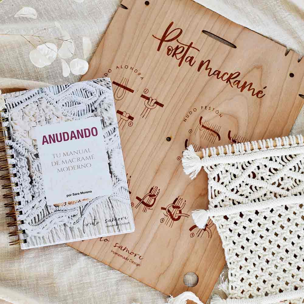Si estás empezando a hacer nudos o eres un experto, este kit no te puede faltar... un libro para ir anotando todas tus ideas y proyectos y con el porta macramé todo se hace mucho más fácil.