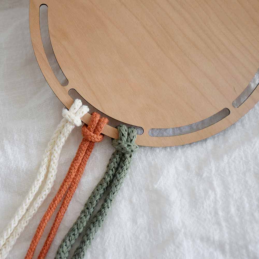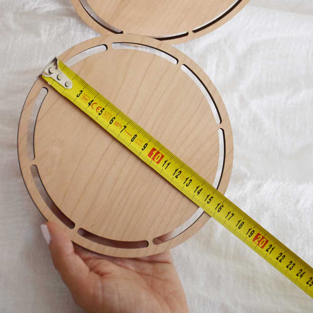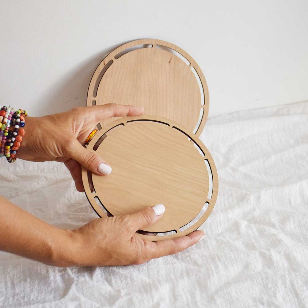 Utiliza nuestro accesorio de madera DM perforada como base para tus bolsos, creaciones circulares …