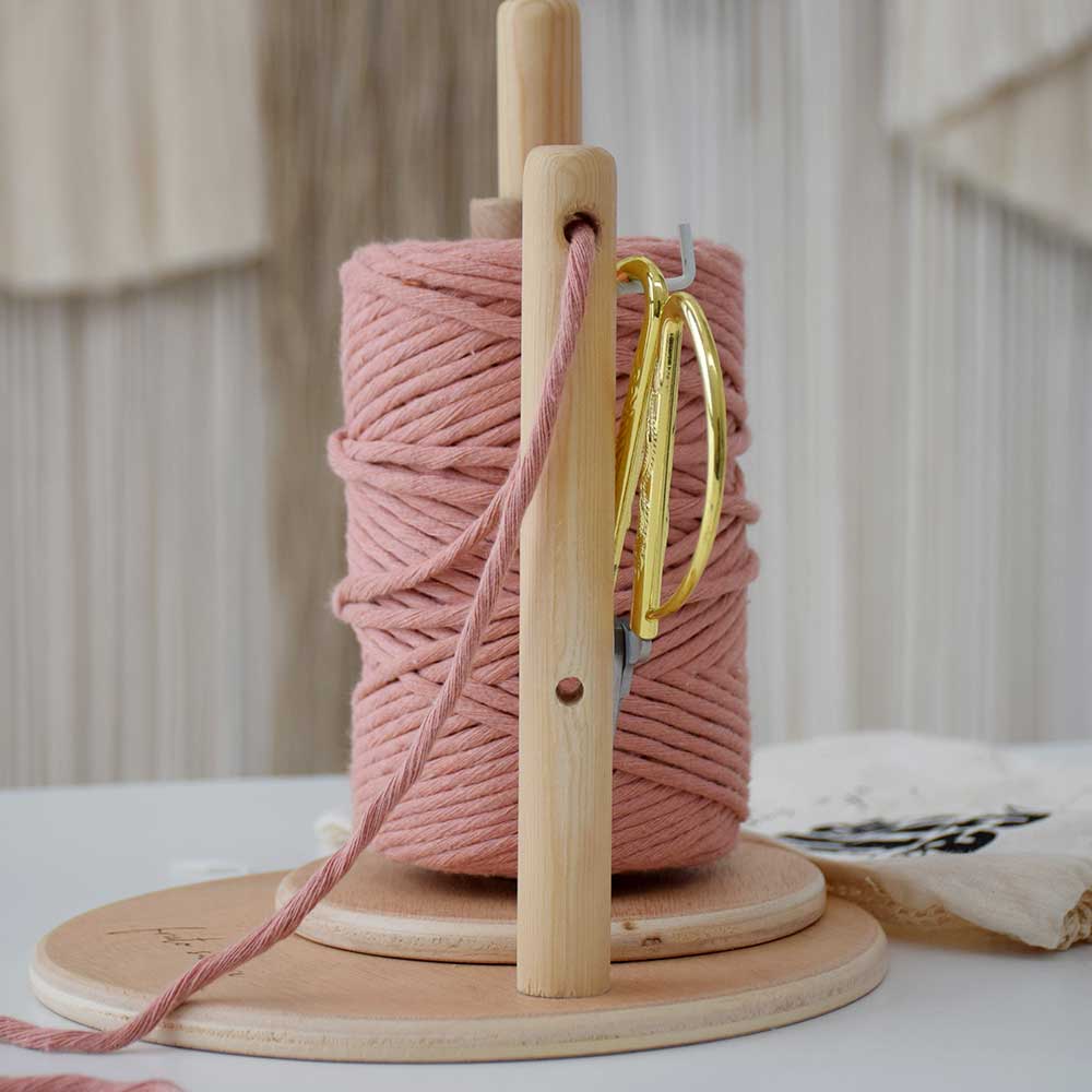 Con un base giratoria de madera sobre otra adicional que hace de base apra que el hilo siempre fluya de forma suave y continua.