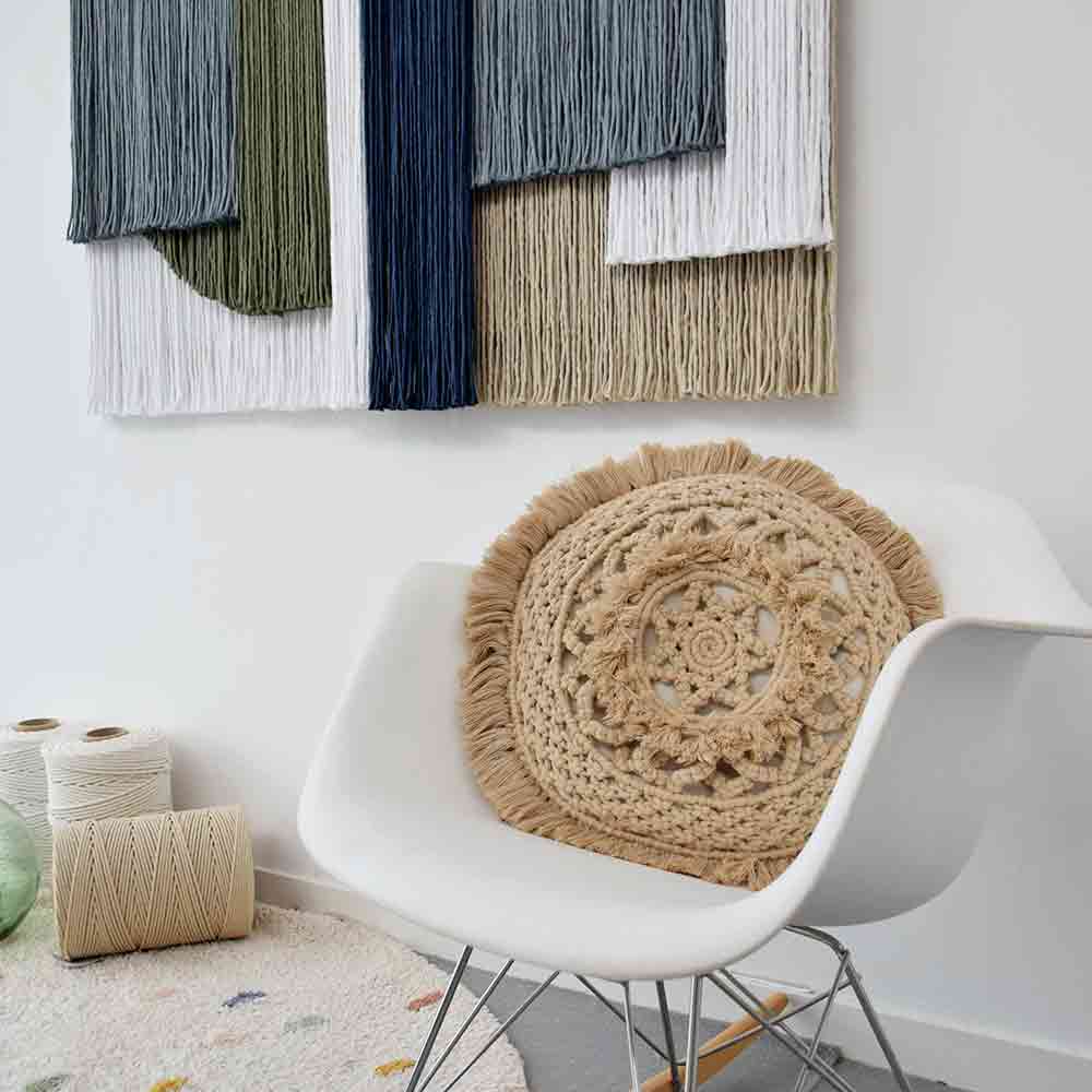 Este proyecto de macramé te permitirá crear con tus propias manos un cojín único, con un acabado elegante y hecho a partir de fibras de alta calidad. Su forma circular y su patrón anudado aportan un aire acogedor y bohemio, ideal para cualquier ambiente.