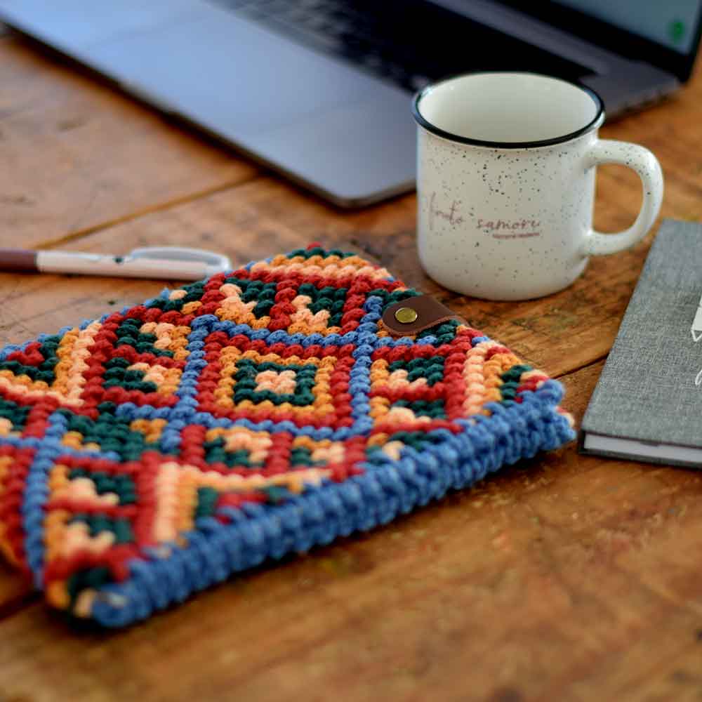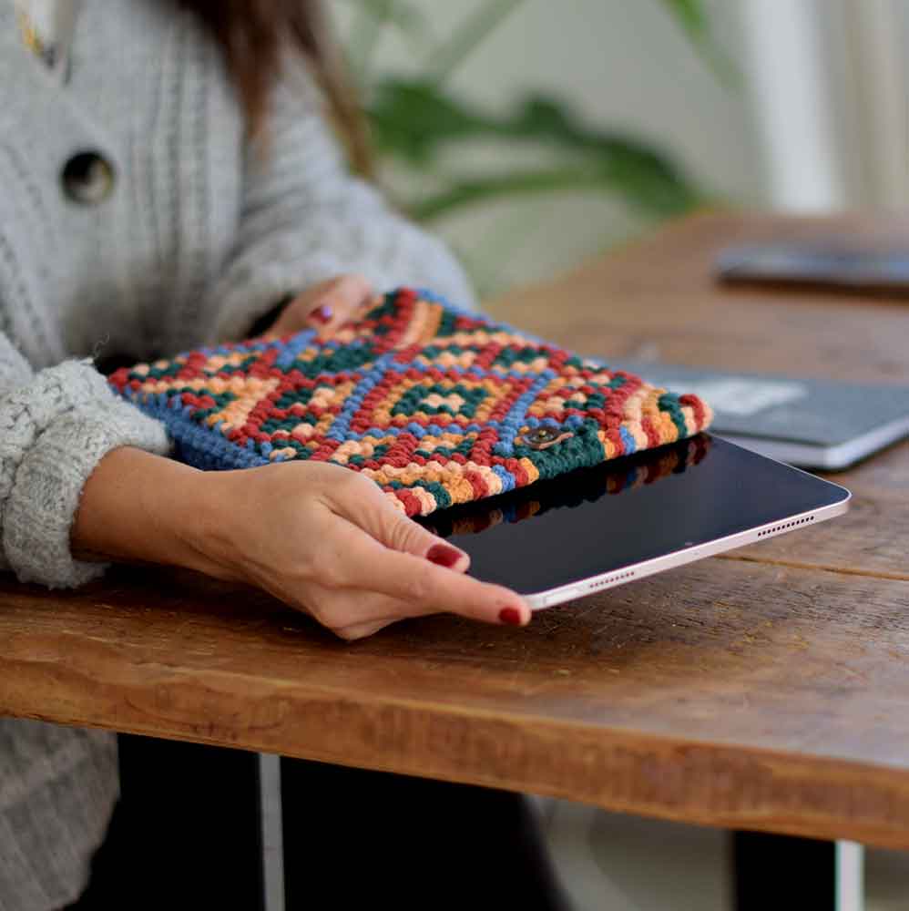 Una funda de macramé para agendas, tablets, ordenadores o cualquier otro dispositivos electrónico inspirada en los pueblos aztecas.