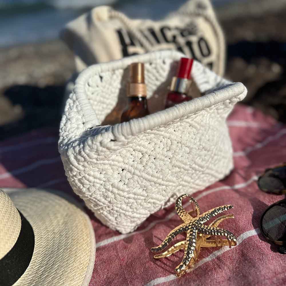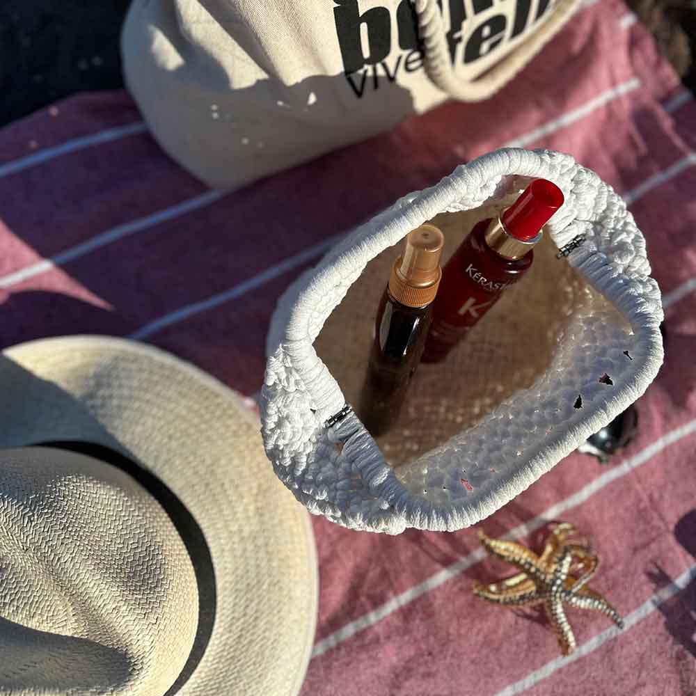 Diseñado para disfrutar del proceso y del resultado. Perfecto para guardar lo esencial en la playa o llevar como bolso de mano en una noche de verano.