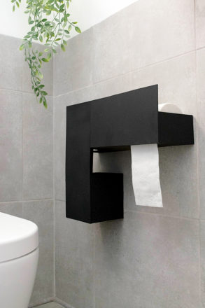 Lo que mas me gusta de este porta rollos es que tanto el papel higiénico como el escobillero quedan totalmente disimulados e integrados con el baño.
