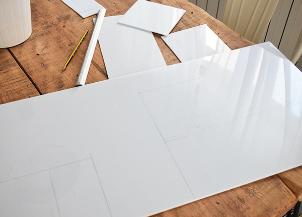 Primero dibujamos en nuestra pieza de poliestireno todos los recortes que tenemos que hacer. Los cortes los podéis hacer con la sierra eléctrica, pero con mucho cuidado porque este material se parte fácilmente. Si lo veis difícil siempre podéis cortar con la sierra manual, os llevará mas tiempo pero es mas difícil que se rompa.