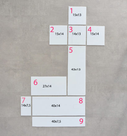 Cortaremos 9 piezas de las medidas que veis en la siguiente foto. Tal y como veis, esta será la estructura y la forma en la que irán pegadas las piezas.