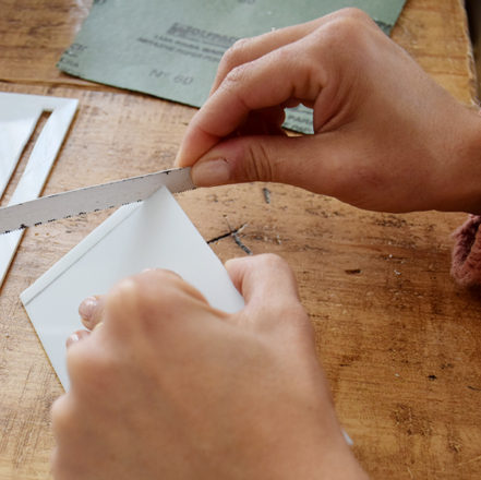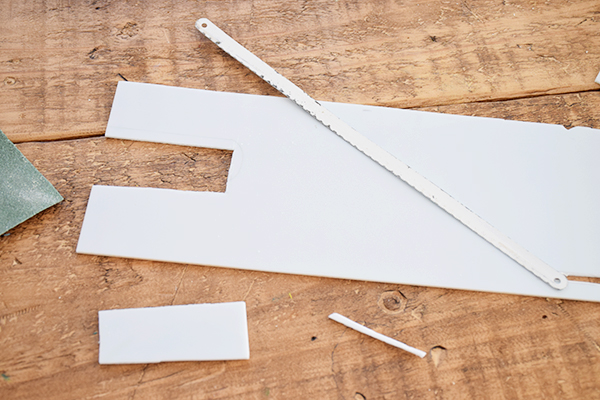 También sobre la misma pieza, cortaremos un rectángulo de 8x4cm para pasar el palo del escobillero. Este corte lo haremos con sierra manual y poco a poco para que no casque nuestra pieza.
