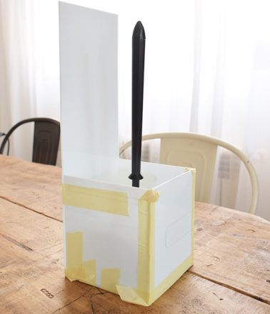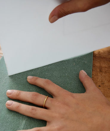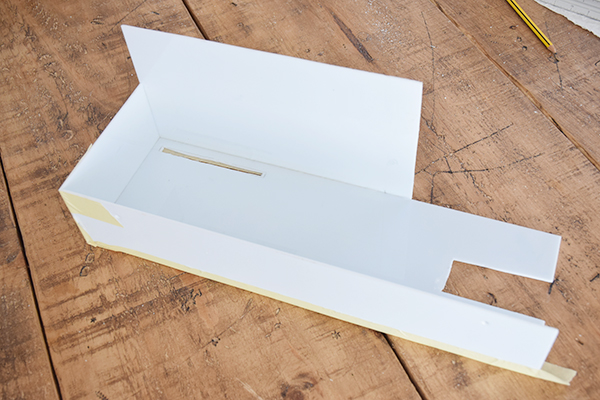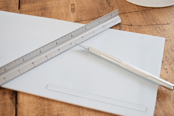 Con un corte de 12cm de largo por 0,5 de ancho será suficiente para poder pasar el papel. Para crear esta ranura tenemos que tener especial paciencia e ir cortando con bisturí y regla hasta profundizar lo suficiente para crear el agujero.