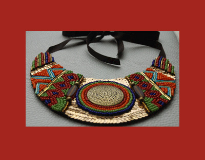 Como todos mis collares, este también esta totalmente hecho a mano, con cuentas de muchos colores, lentejuelas doradas y una pieza central en oro viejo con dibujos perforados, todo ello sobre una base en piel natural.