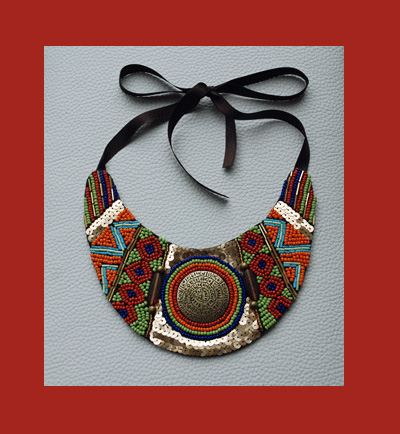 Esta inspirado en el estilo navajo que tanto esta de moda ahora. Estaréis viendo que en todas las tiendas hay artículos con este estampado, bolsos, carteras, camisetas, vestidos….y ahora con Fruto Samore en collares babero!! 😉