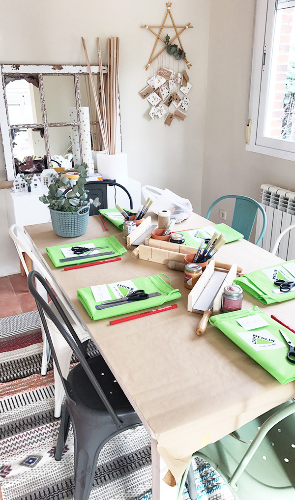 Una vez ideado el diseño que quería desarrollar en mi taller, Leroy Merlin me proporcionó todos los materiales para mi y mis asistentes. Ya teníamos todo dispuesto para llevar a cabo nuestro calendario de adviento en forma de estrella que os enseñé en el post anterior.