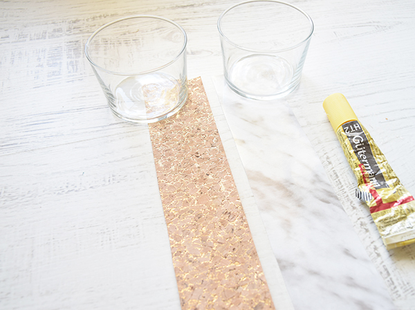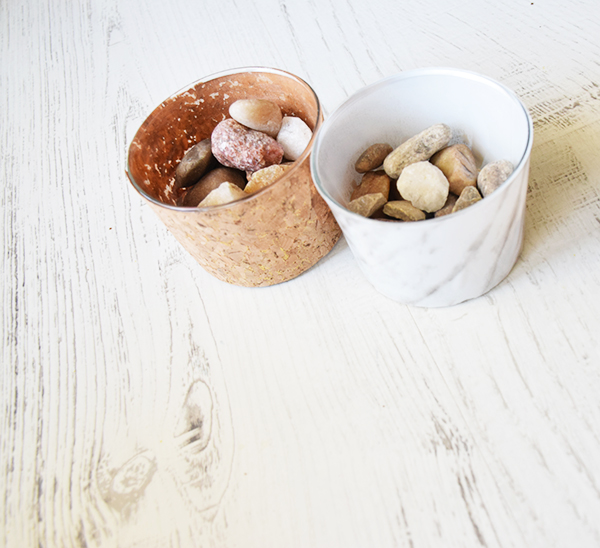 Primero empezamos cortando 2 tiras del ancho de los vasos para decorar y usar a modo de macetas. Esta tela de corcho es una maravilla para coser y hacer accesorios originales con este material, pero en este caso sólo lo hemos pegado con pegamento al vaso y también queda fenomenal.