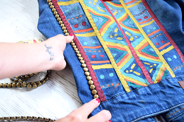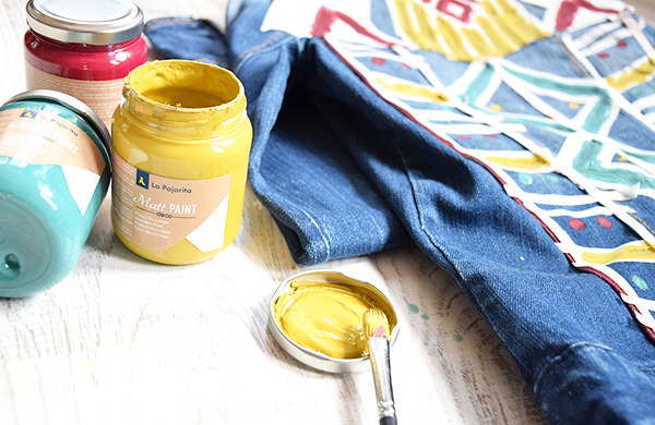 Dejamos secar la primera capa y volvemos a cubrir sobre lo pintado para no manchar y seguir con el diseño de nuestra cazadora étnica. Deberemos dar entre 2 y 3 capas, dependiendo del textil escogido, en mi caso le tuve que dar 3 capas porque la tela vaquera absorbe mucho el color.