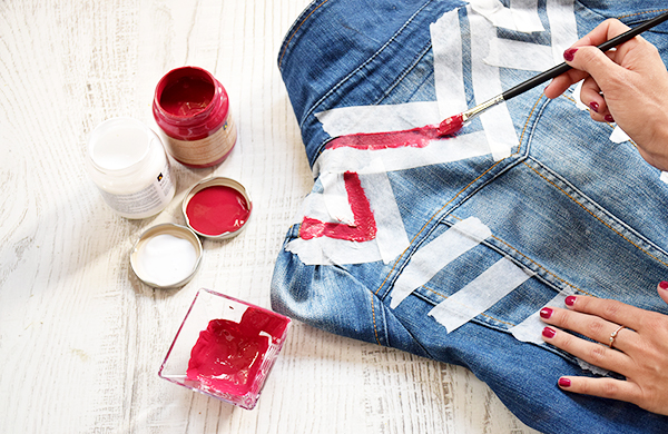 El primer paso es preparar la cazadora vaquera, si en vuestro caso es nueva, debéis lavarla previamente. Con cinta de carrocero vamos haciendo el dibujo sobre la cazadora, yo he customizado la trasera y los bolsillos delanteros. Os recomiendo dibujar sobre papel antes el diseño mezclando los colores para ver cual es la mejor combinación de todas y poder tener una visualización final antes de empezar a pintar la cazadora.