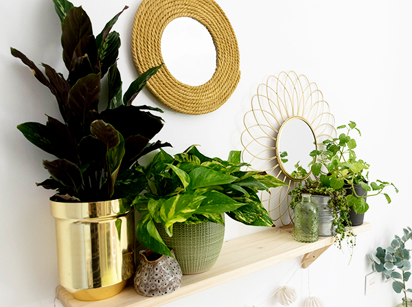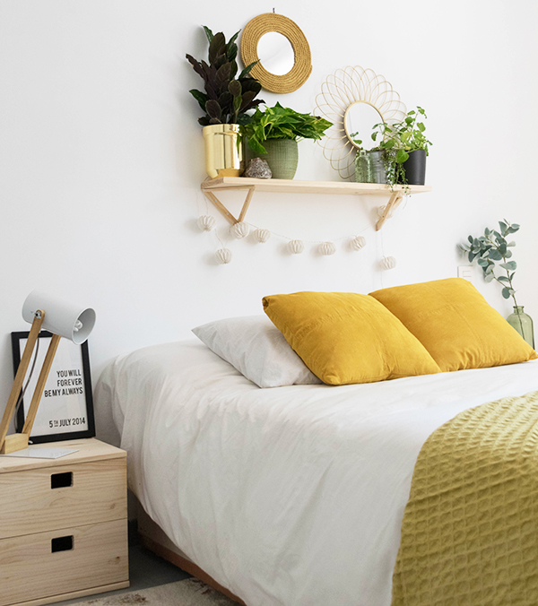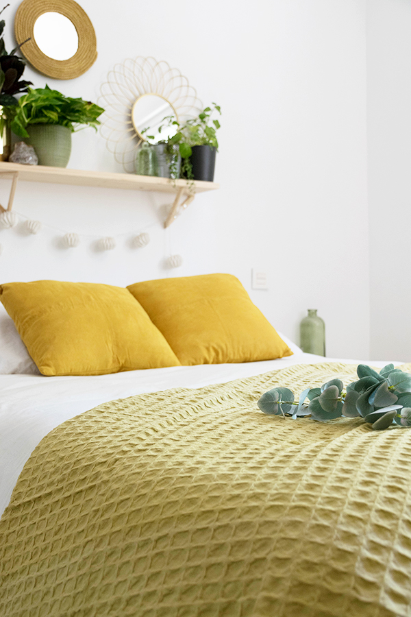 Como veis he escogido de cabecero para este dormitorio una estantería de Astigarraga Kit Line junto con sus triangle, unas cuantas plantitas y estos dos espejos dorados. Una decoración sencilla y acogedora para que nuestros invitados se sientan como en casa.