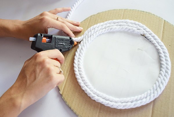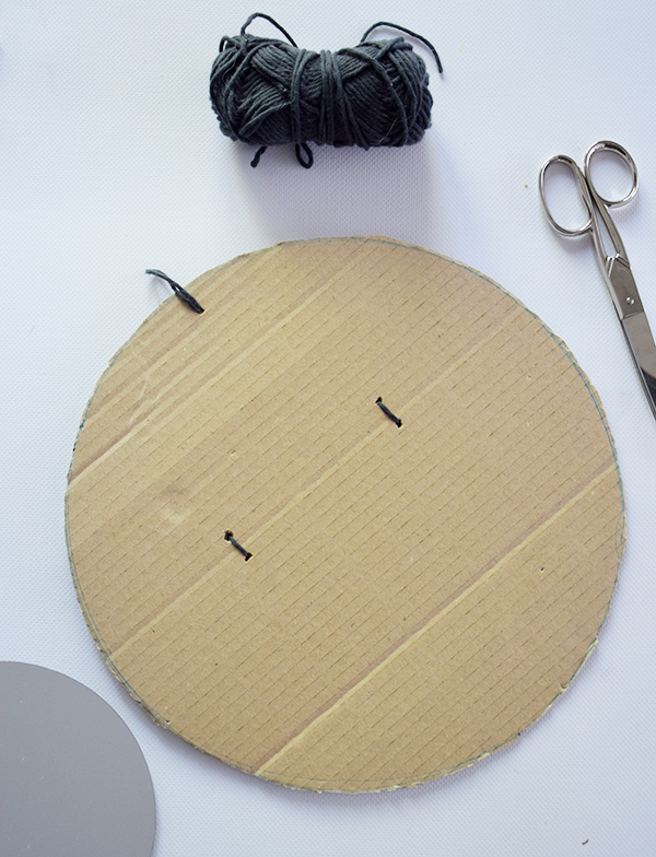 Empezamos recortando un circulo el cartón del tamaño aproximado que queramos nuestro espejo. Hacemos unos agujeros para pasar una cuerda fina que nos servirá para colgar de la pared. Ataremos los cabos con varios nudos para que no se salgan por los agujeros que hemos hecho.