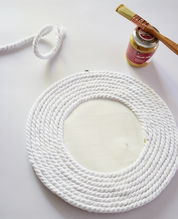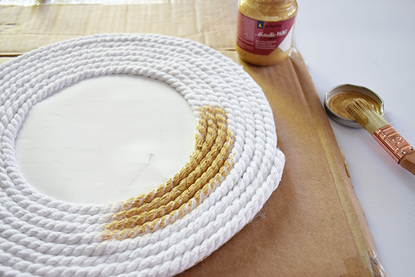 Cuando hayamos acabado, pegaremos el extremo de la cuerda por detrás y sin quitar el folio protector pintaremos de dorado. Al ser cuerda rizada tendremos que insistir bien con la pintura y ser bien generosos.