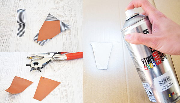 Decoraremos con spray a nuestro gusto ayudándonos de wasi tape para proteger las zonas que no queremos pintar y con un sacabocados haremos un agujero en cada pieza, haciendo que coincidan entre si al juntar ambas.