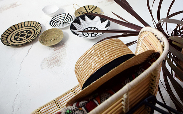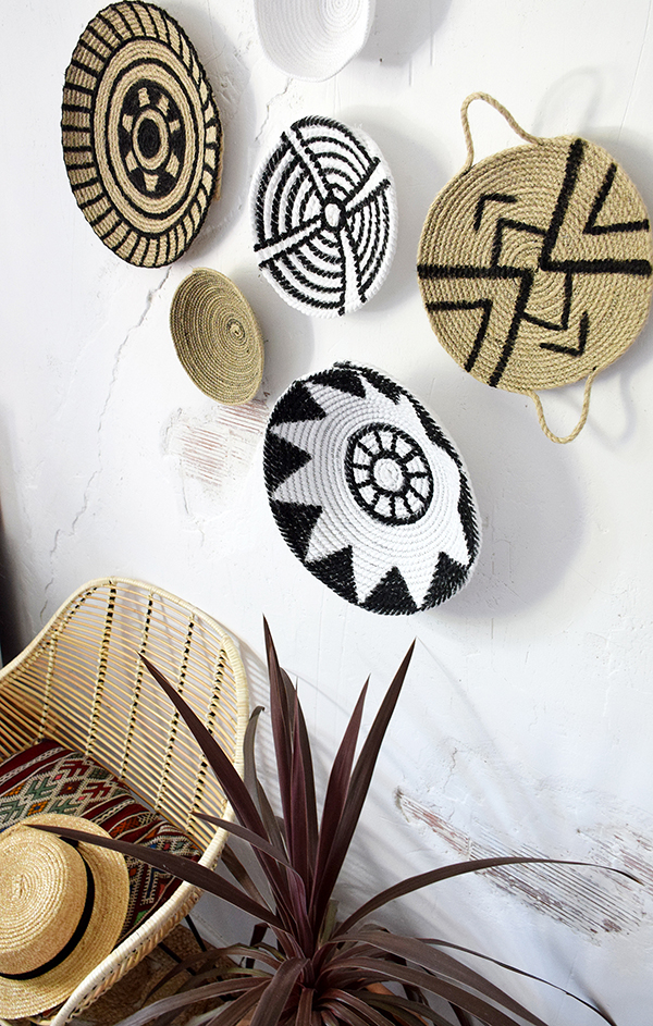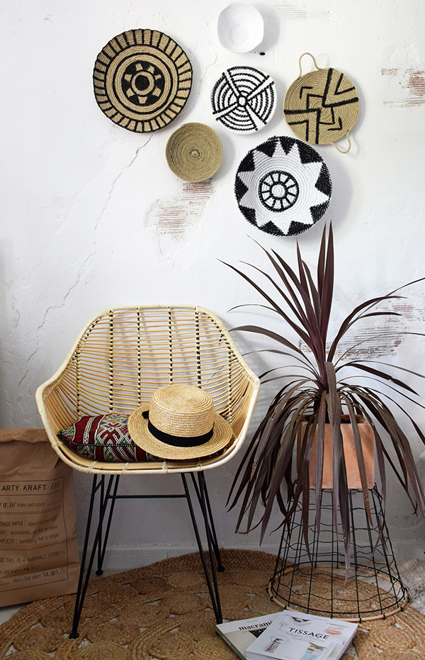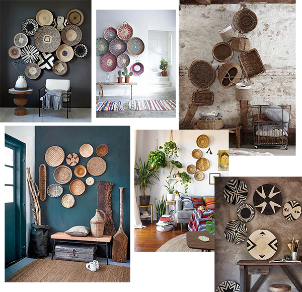 Una pieza fundamental que no puede faltar en este estilo son los cestos de paja, todas tenemos uno en casa almacenando mantas, cojines, revistas o plantas, pues bien, también tenemos la versión de cestos de pared. Diréis en la pared?? pero eso como es?? pues en forma de mural, al igual que ponemos cuadros o laminas….