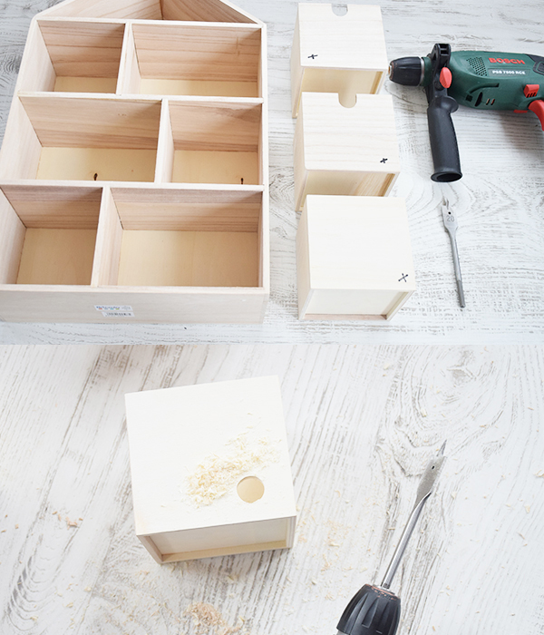 Empezamos marcando las zonas de las cajitas donde queremos hacer los agujeros con la broca de calar. He elegido las cajas porque es la mejor forma de sujetar los palos que harán de perchero de la mejor forma sin que quede a la vista. Hay que dejar margenes de sobra alrededor del agujero para no estropear los perfiles de la caja y un poco mas elevado de la parte inferior para que al pegarlo con la cara interior el palo quede ligeramente inclinado hacia arriba, de esta forma lo que colguemos quedará bien sujeto y no se caerá.