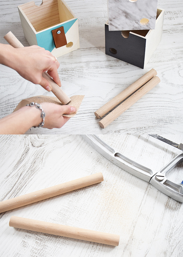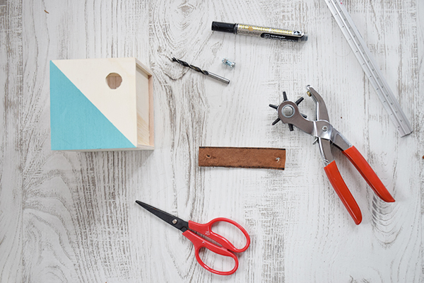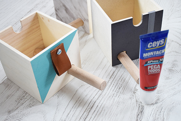 A una de las cajas yo le di la vuelta para hacer el agujero y pintarla, porque le hecho su propio tirador con una tira de piel. Taladraremos un agujero por el que pasaremos el tornillo y la tuerca sujetando la tira de piel a la madera.