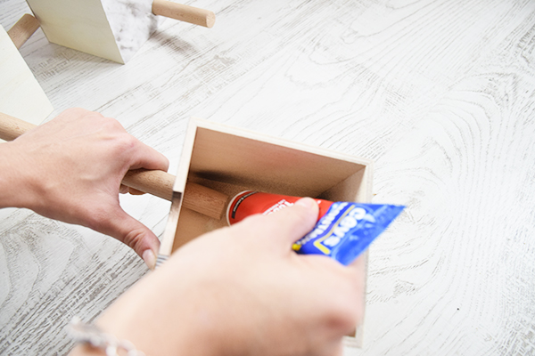 Pegaremos los palos por el interior de la cajita en la parte posterior y justo en la zona del agujero y dejaremos secar 24 horas.