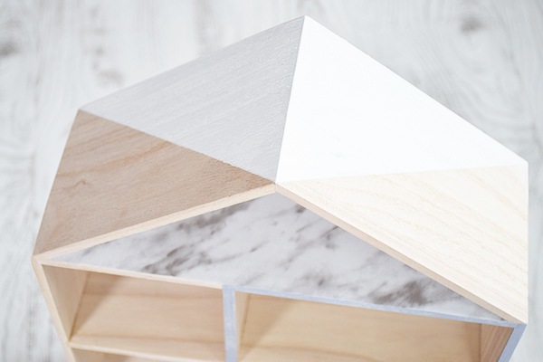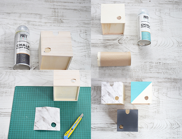 Mientras dejamos secar estas piezas decoraremos la estructura de la casita. Yo no he querido pecar en demasía y tan solo he puesto una base en vinilo mármol y en turquesa, un frontal en gris claro y he pintado el tejado en forma geometrica con Spray Blanco.