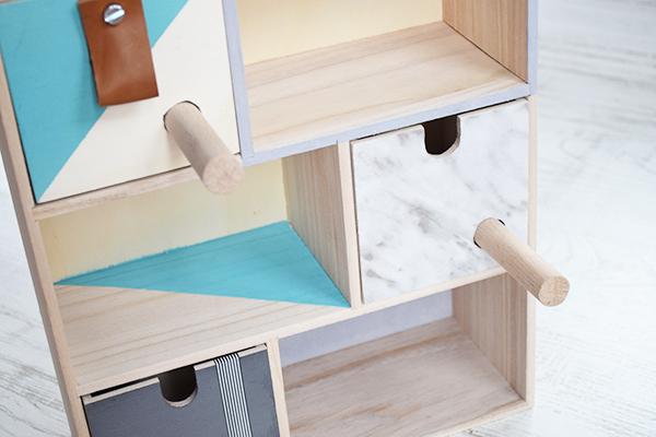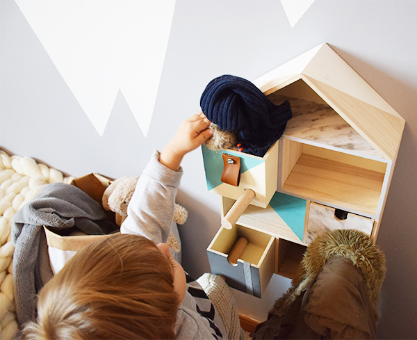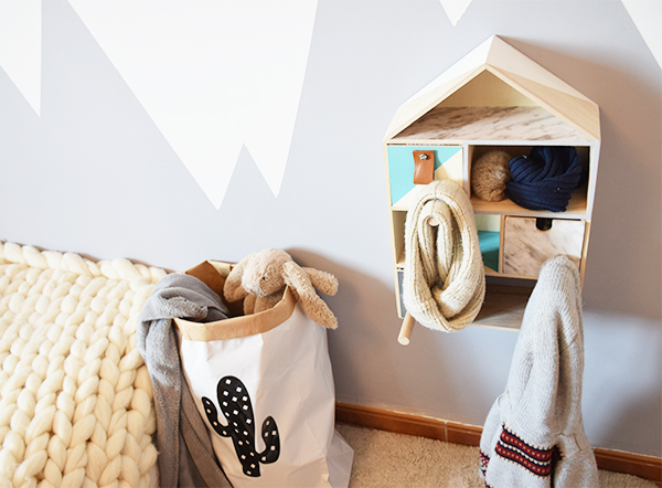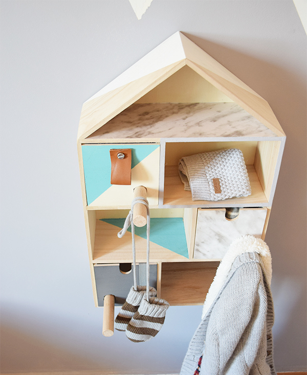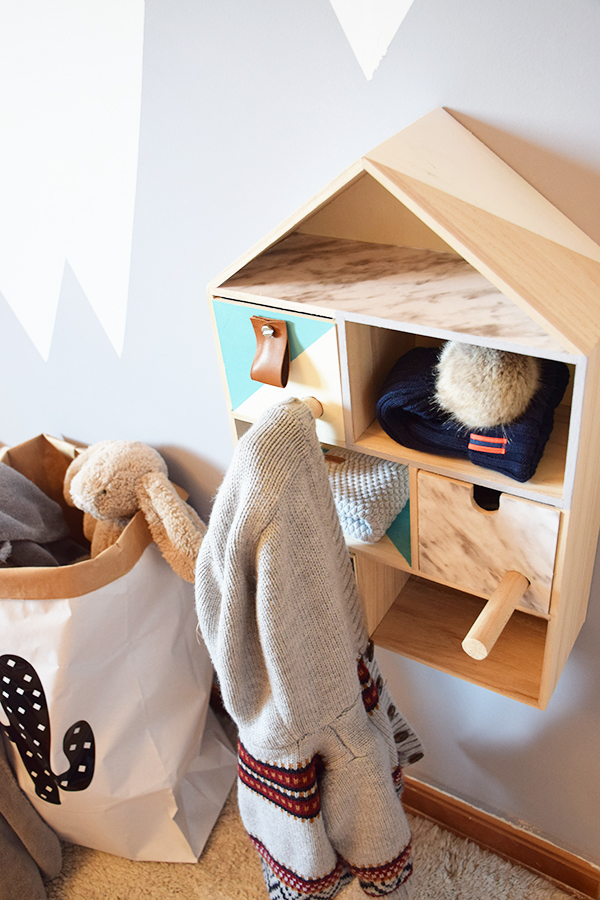 Primero pensé en un tablón de madera con forma de árbol, pero quizás le iba a dar un toque navideño eterno a la habitación…. así que desechada la idea, la siguiente fue un perchero en forma de flecha para ir en sintonismo con su cuarto, pero no me terminaba de gustar…. transcurrieron unos días en los que no se me ocurría nada, hasta que navegando por Creavea vi la solución, tienen una casita de madera con cajoncitos ideal, que con un poco de mano creativa y algunos retoques podríamos conseguir el perchero perfecto, donde colgar el abrigo y bufanda además de poder guardar guantes, cintos o gorras en sus cajones y compartimentos, por no decir de lo cuqui que es!! Si no tenéis tiempo de ir de mercerías y tiendas de manualidades os recomiendo esta pagina, lo tiene todo y te lo envían a casa super rápido!