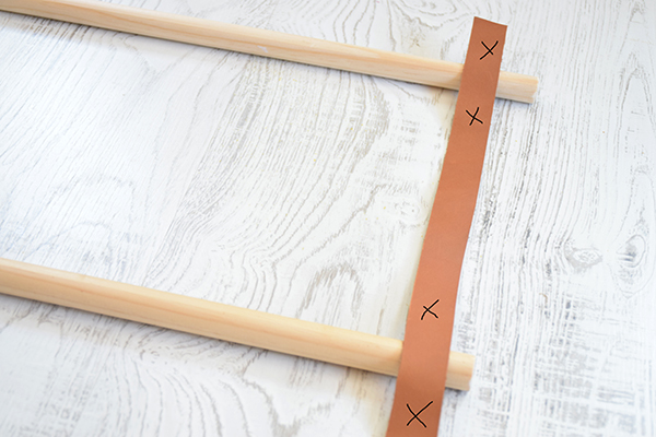 Marcaremos las zonas donde vamos hacer los agujeros con el sacabocados. Haremos dos agujeros por cada extremo del palo, uno arriba y otro abajo con la suficiente distancia para que entre nuestro palo de madera. En total por cada tira tendremos que hacer 6 agujeros, 5 pequeños para las tuercas y uno mas grande para el ojete.