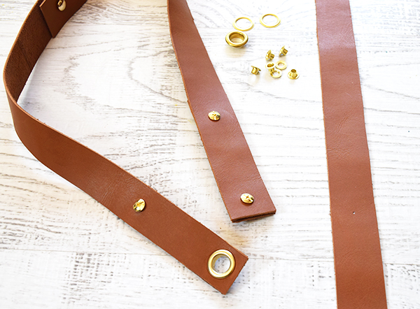 Lo mismo haremos con los recortes de piel mas pequeños, que irán en la trasera de la tira principal, justo donde van los agujeros y que hará de unión para pasar el palo por dentro.