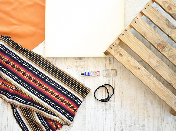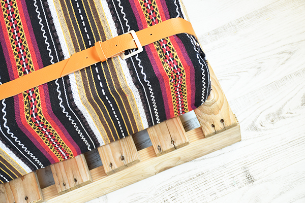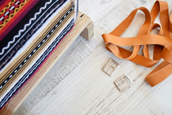 Necesitaremos, espuma, un palet pequeño, tela étnica o kilim, tiras de piel, hebillas, velcro y pegamento textil. La tela, el velcro y las hebillas son de Almacenes Cobian, la espuma la podéis encontrar en packs de 4 en Leroy Merlin, yo he necesitado 5 bloques para alcanzar el grosor deseado, la piel en cualquier curtiduria y el palet lo teníamos de material que compramos para el jardín, pero seguro que en cualquier obra os regalan uno! 😉