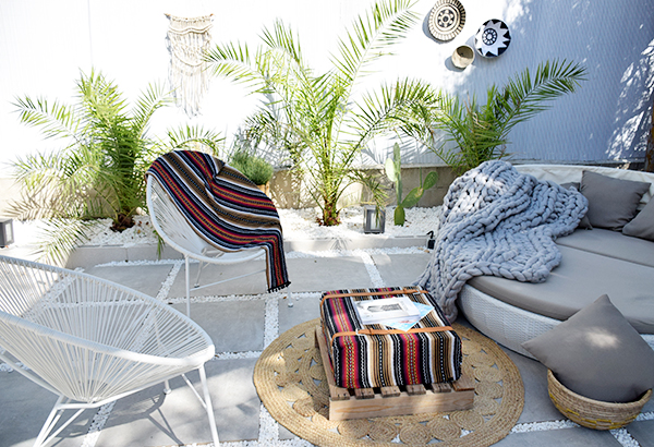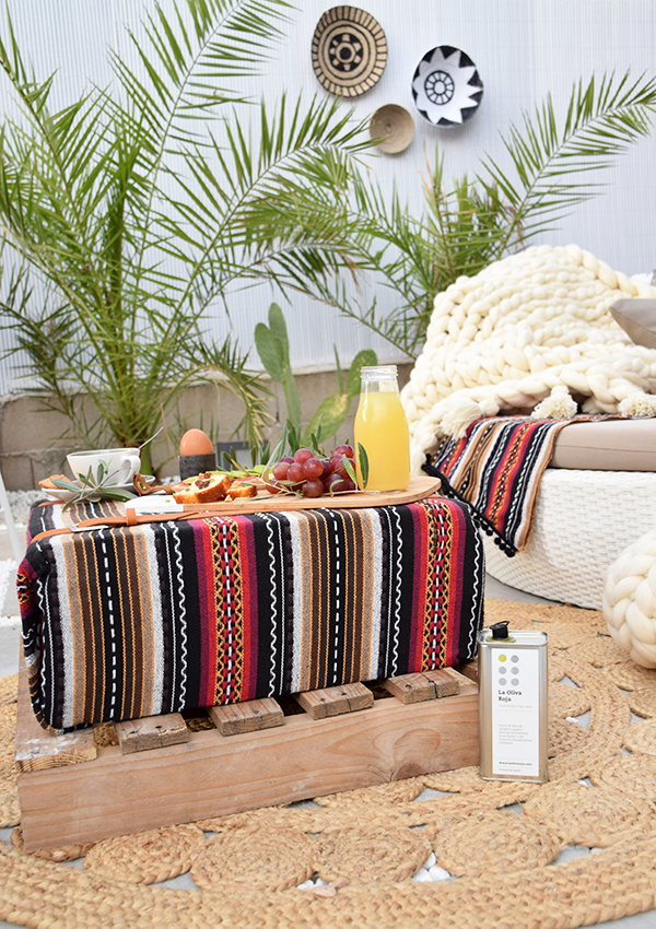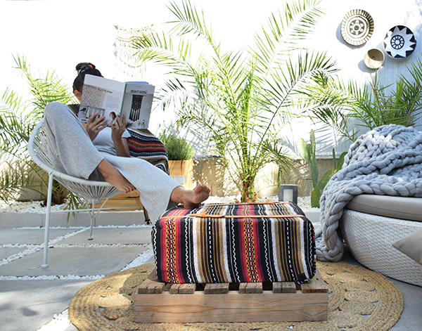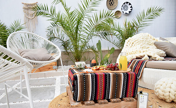 Como veis le he dado también mi toque a la pared con un tapiz de macramé hecho con yute para que aguante en exterior, también he guardado los cojines tropicales que hice en este post, ya que lo veo mas indicado para verano y el toque boho y kilim pega mucho más con esta época del año.